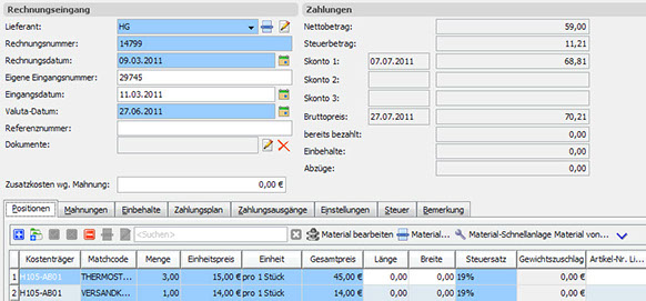 Im Rechnungseingang erfassen wir alle auftragsbezogenen Rechnungen, die automatisch in die Offene-Posten-Verwaltung wandern und von dort bezahlt werden können.