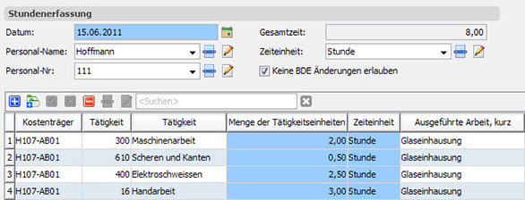 Über die Stundenerfassung werden alle geleisteten Stunden den Aufträgen zugewiesen, so dass wir jederzeit den Überblick haben, inwieweit die kalkulierten Stunden mit den tatsächlich geleisteten übereinstimmen.